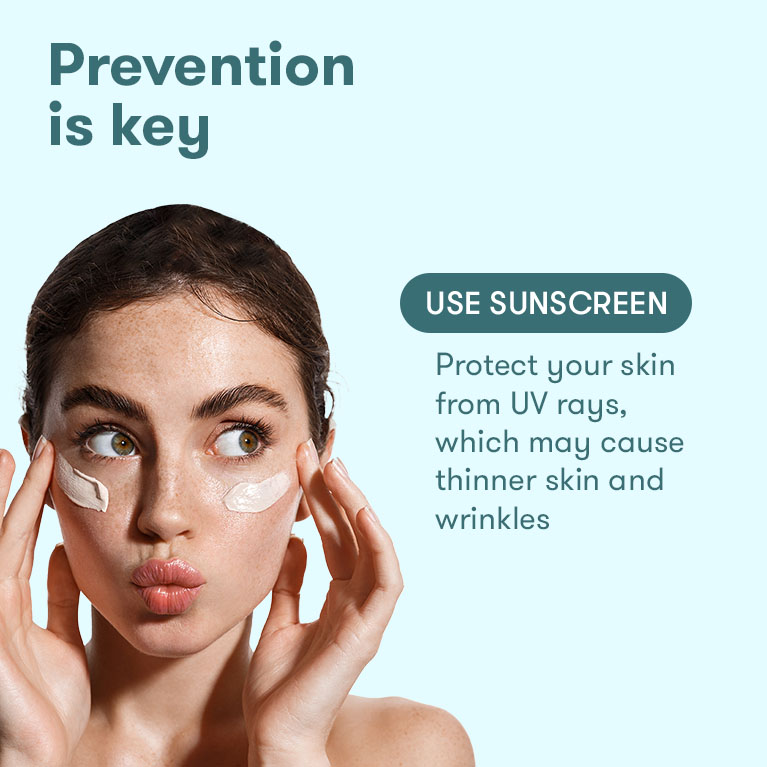 - Usepreventative measureslike sunscreen, serums, and moisturizers to protect your skin.